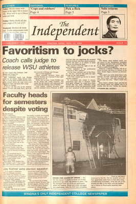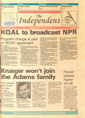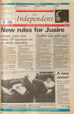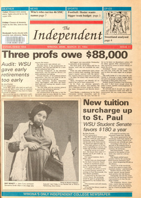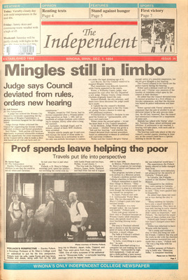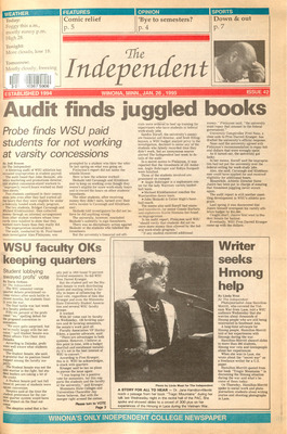 The mission of The Independent, a Winona State University weekly campus newspaper, was to publish stories with no financial connections to the campus administration or student governments. Business Manager: John Vivian