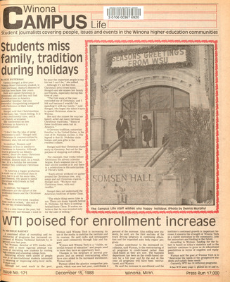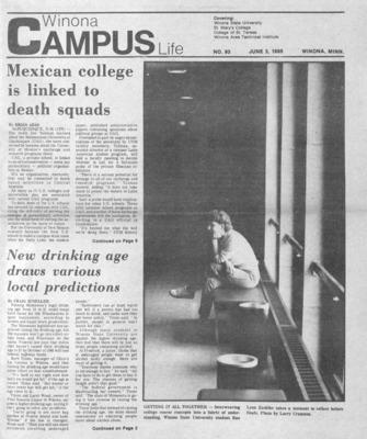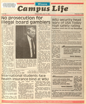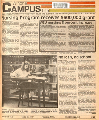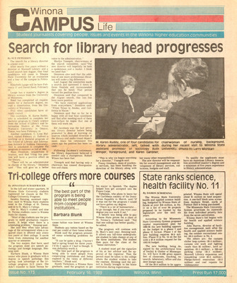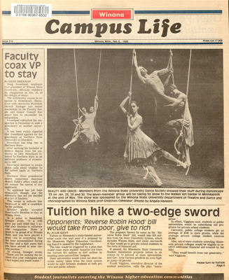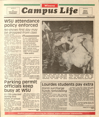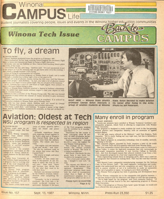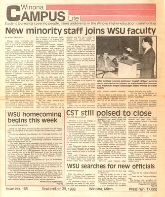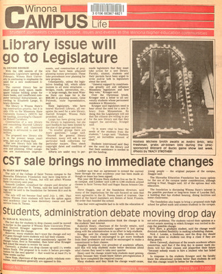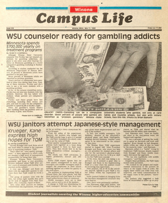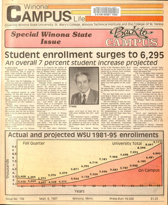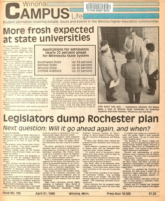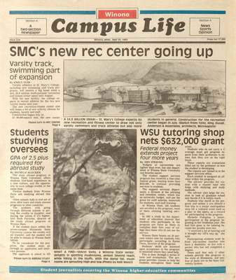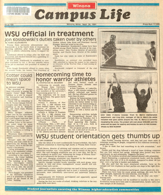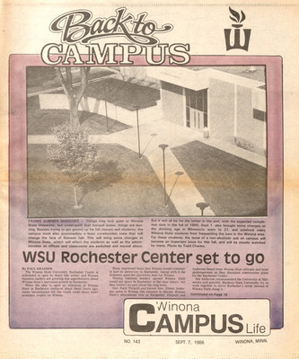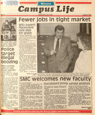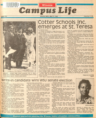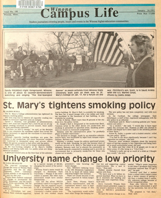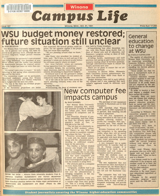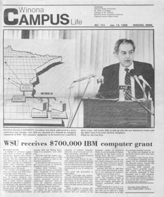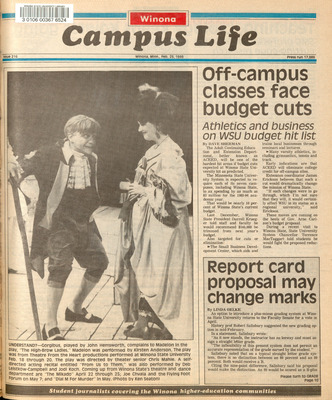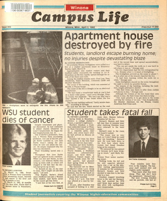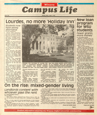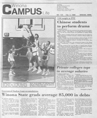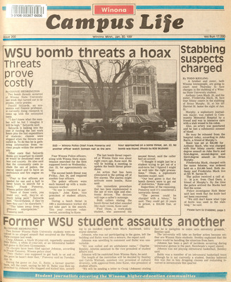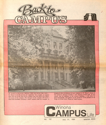 Winona Campus Life was a weekly laboratory newspaper produced by the WSU Mass Communication Department students and printed as a supplement to the Sunday Winona Daily News, which began in September 1983. The newspaper provided coverage of the four institutions of higher education in Winona: Winona State University, St. Mary's University, College of Saint Teresa, and Winona Area Vocational-Technical School.