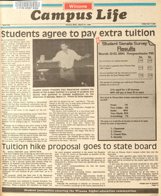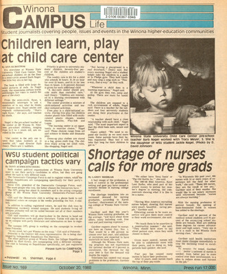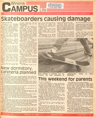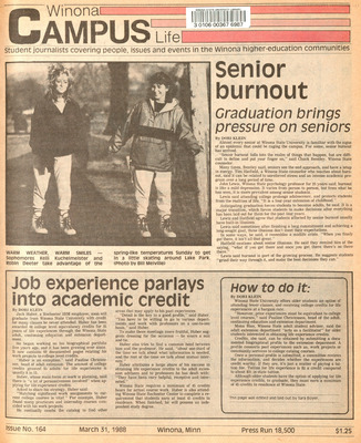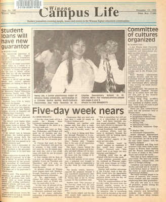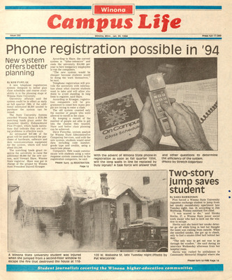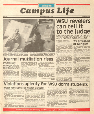 Winona Campus Life was a weekly laboratory newspaper produced by the WSU Mass Communciation Department students and printed as a supplement to the Sunday Winona Daily News, which began in September 1983. The newspaper provided coverage of the four institutions of higher education in Winona: Winona State University, St. Mary's University, College of Saint Teresa, and Winona Area Vocational-Technical School. It was created to provide a place for Mass Communcation students to publish their articles and photographs with the idea of generating reader feedback, which is essential in journalism education.