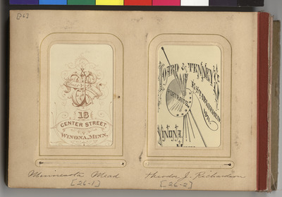 On the back of the postcard is professional printing on one half: Hoard & Tenney's Portraits, establised 1871, And the second half has Elmer Tenney, 18 Center Street, Winona, Minn. There is handwritten text under the printed portions: Minnesota, Mead? [26-1]; Theodor J. Richardson [26-2]