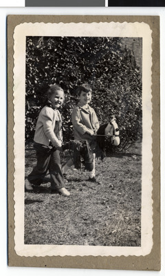 Two Phelps Kindergarten students playing outdoors on hobby horese.