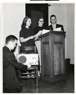 Two Winona State Teachers College students reading at a podium during a class on radio news broadcasting.
