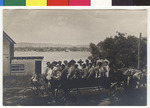 Female students riding in a wagon by the Mississippi River in Wisconsin. The city of Winona is faintly visible on the opposite bank.