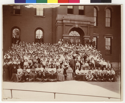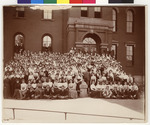 Group photograph of the 1898 Winona Normal School graduating class of 1898 with their faculty taken in front of Old Main.