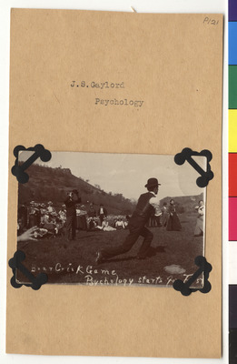 Professor J. S. Gaylord at bat during a Winona Normal School picnic at Bear Creek. He is running for first base just after hitting the ball.