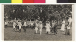The kindergarten class from the Winona Normal School's laboratory school dancing on the grass in front of Phelps Hall.