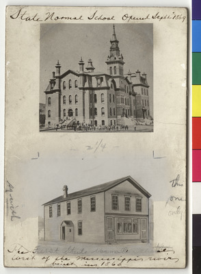 Early picture of the State Normal School's first buildings. The lower is the original, first used in 1860. The upper is Old Main, opened September 1, 1869.