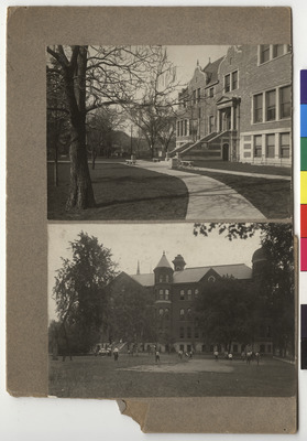 Upper image shows Odgen hall in fall. Lower image shows Old Main Building with students playing baseball in front.